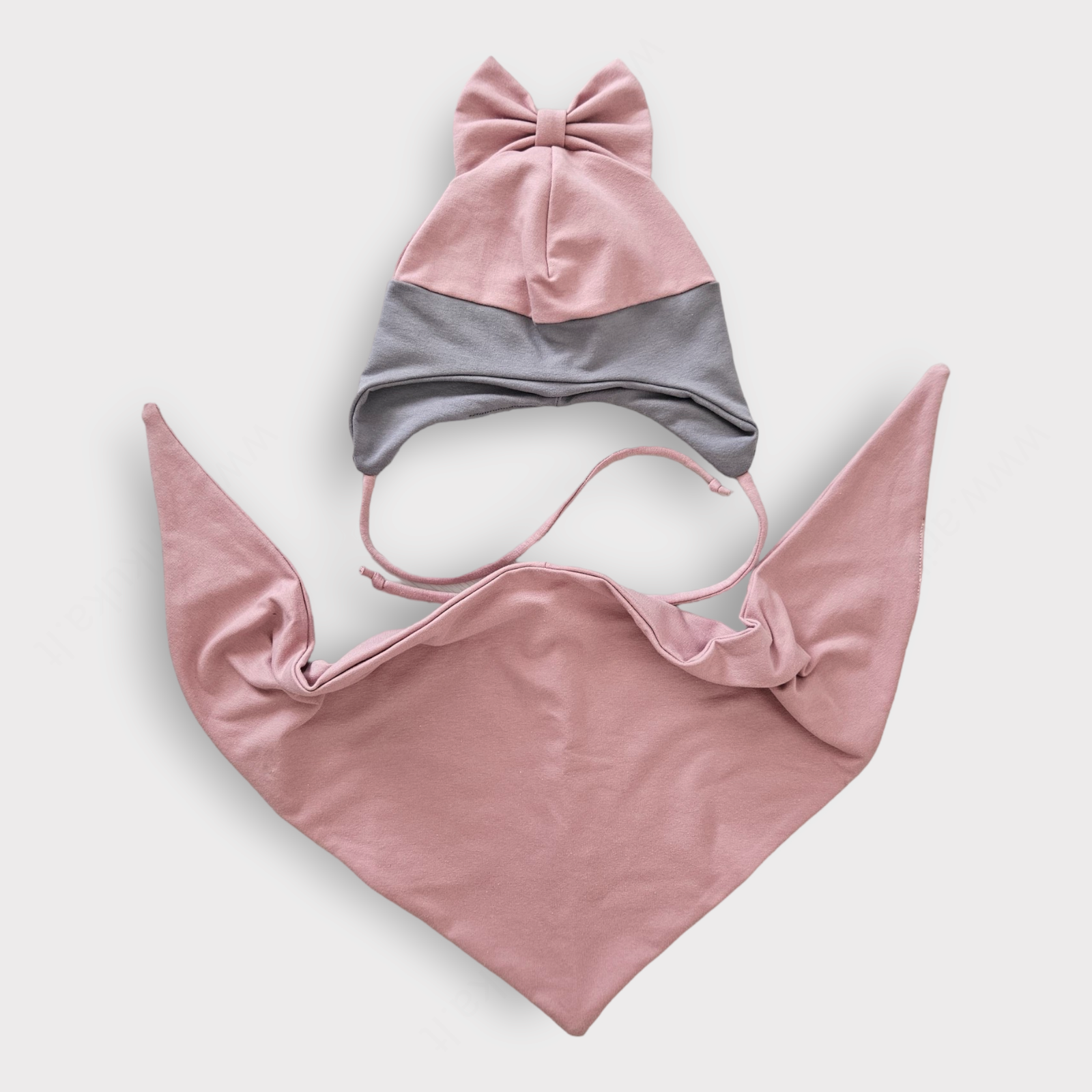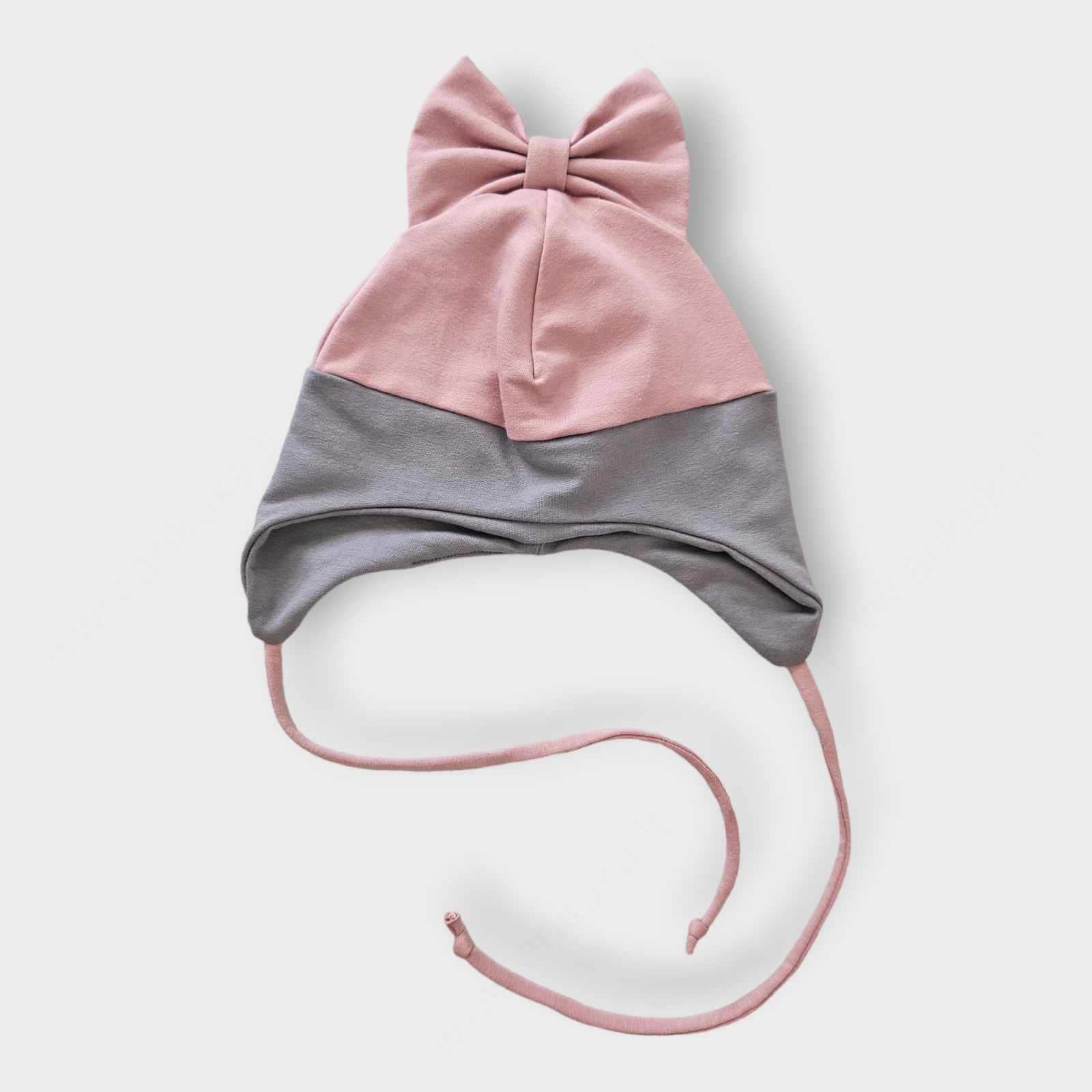 Kepurytė su kaspinu iš medvilnės kilpinio trikotažo (92% medvilnė, 8% elastanas).